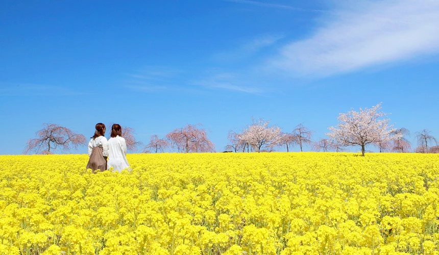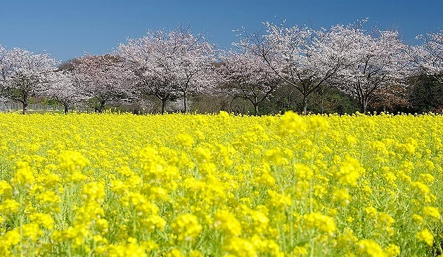 ① 樱花与油菜花同时盛开,粉白与金黄交织