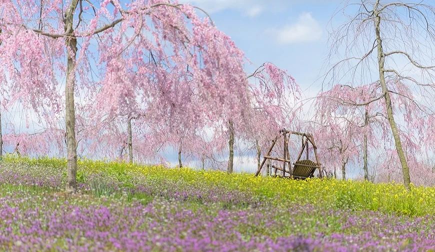 在地人才知道的赏樱秘境!位于岛根县云南市的「斐川公园」(冰川公园),每到春天,从正面入口一路延伸的约1,000棵樱花树齐放,形成气势十足的樱花隧道,美景相当壮观。除了成排樱花之外,园内还有一株独立伫立的枝垂樱,满开时花枝如瀑布般垂落,彷佛樱花雨洒落眼前,是相当热门的拍照景点呢!