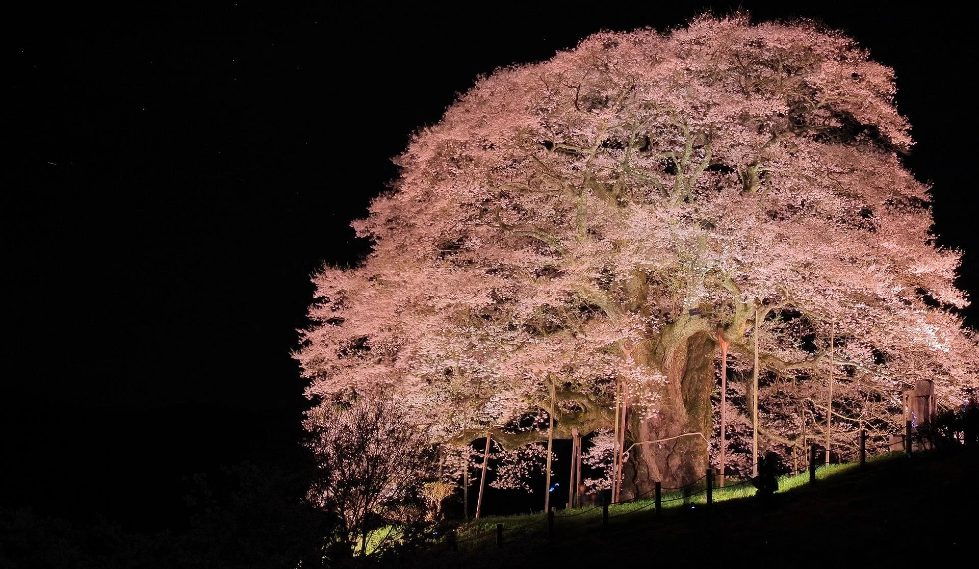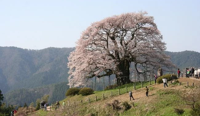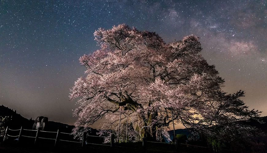被誉为冈山县第一巨木的「醍醐樱」,矗立于真庭市恬静的山间,一般认为树龄已超过700年,被指定为冈山县天然纪念物,并入选「新日本名木百选」。相传后醍醐天皇曾于此地赏樱,因此得名。醍醐樱树高约18公尺,树围约7公尺,枝叶向东西南北延展约20公尺,气势十分壮观;夜晚点灯后,在星空映衬下更显梦幻迷人。每到樱花满开时期,总有许多游客专程前来赏花,周边道路常常塞车很严重,建议可以尽量挑平日清晨造访,能更悠闲地欣赏这株震撼人心的一本樱喔!