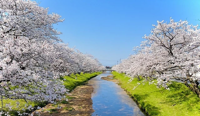 ② 河畔约千株樱花盛开,同时欣赏桥景、河景与花景