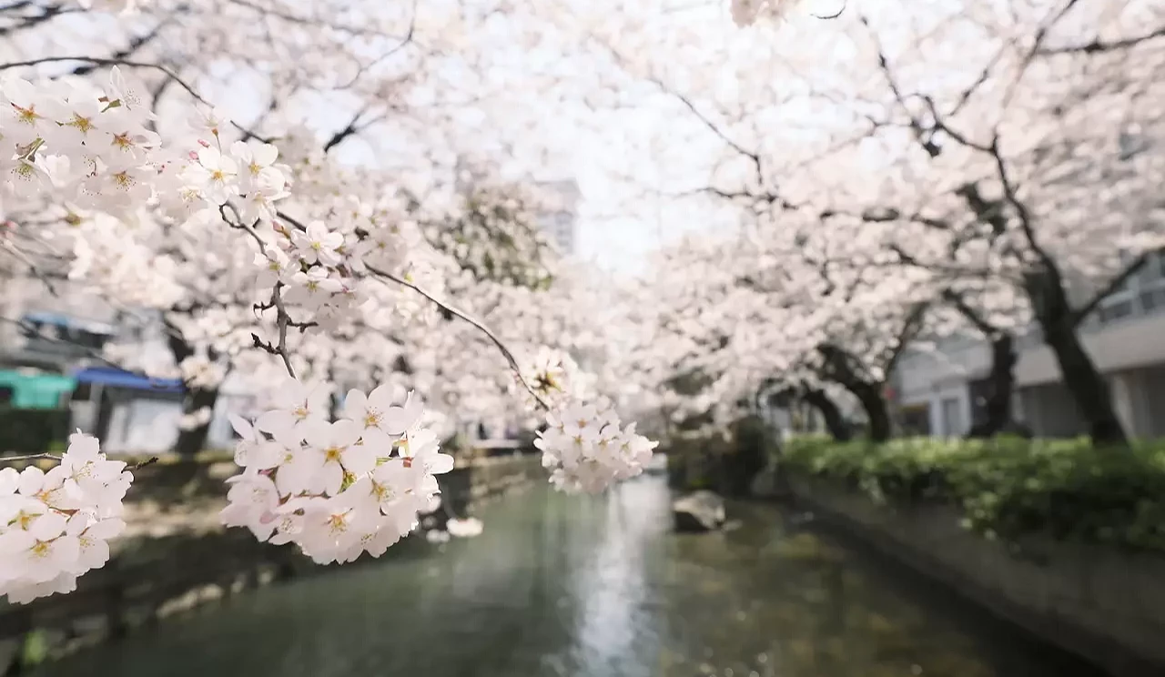 ① 樱花沿溪流绵延盛开美景